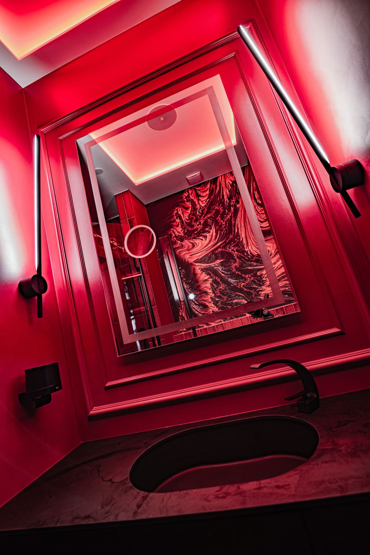 Światło i multimedia: System multimediów, telewizor, system audio z play listami. Unikatowe oświetlenie, system LED w ścianach i suficie, które dowolnie możecie Państwo zmieniać. Sensualne display-e erotyczne na ścianach. Dodające pikanterii lustra zawieszone na sufitach i na ścianie.